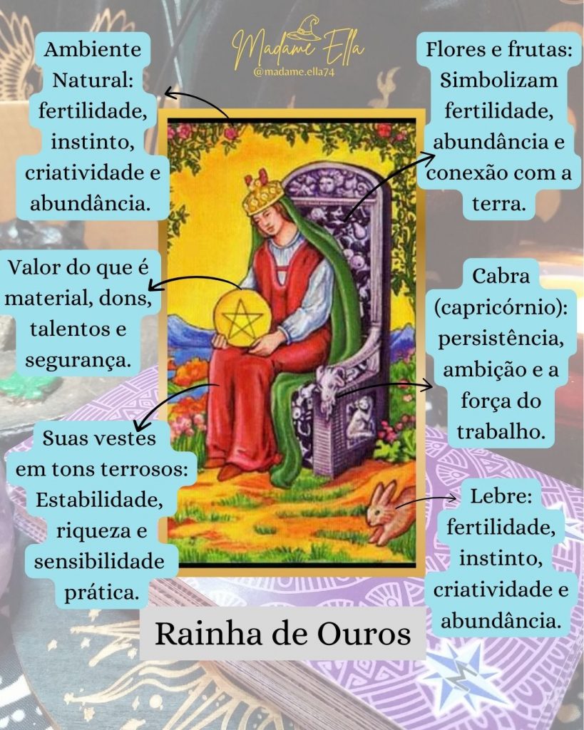 • A Rainha de Ouros representa alguém que tem um bom domínio sobre o mundo material.