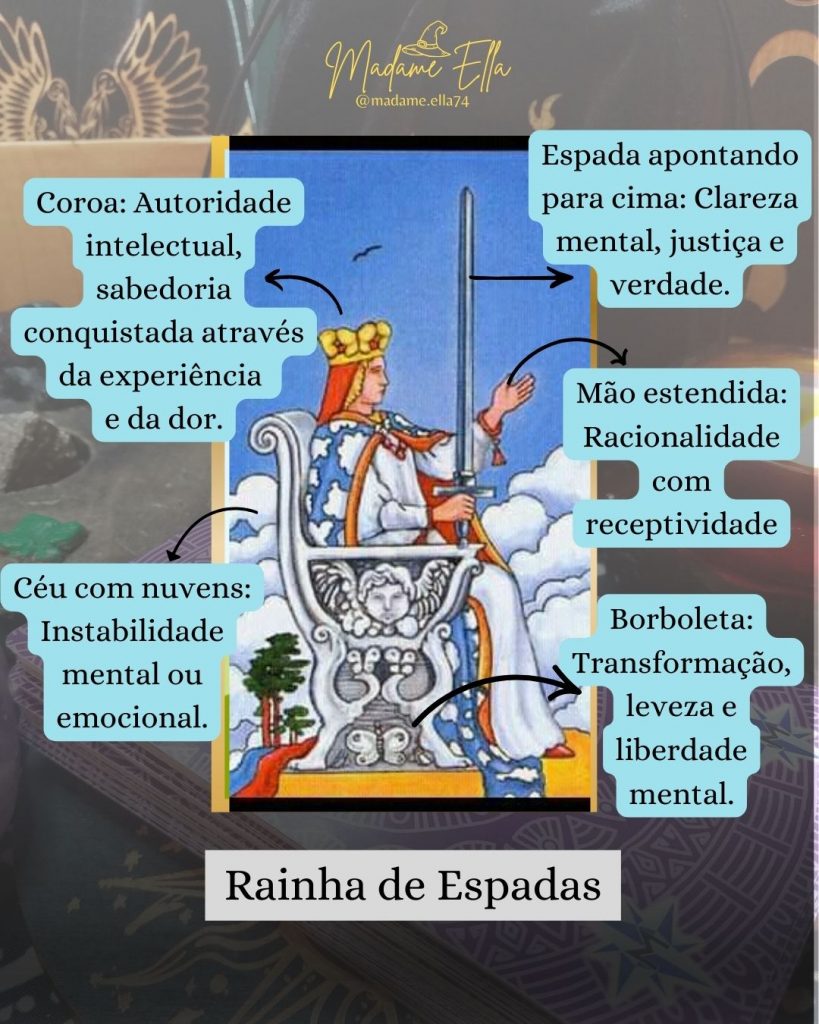- A Rainha de Espadas é emocionalmente autônoma. Ela já sofreu, aprendeu, e agora se mantém firme sem depender dos outros para validar seus sentimentos.
