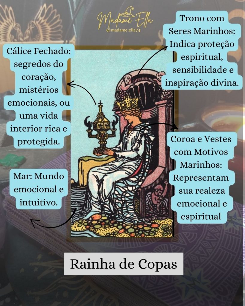 A Rainha de Copas é a personificação da emoção, do afeto e da entrega. Sensível e profundamente intuitiva, ela oferece exatamente o que o outro precisa — como se sentisse, instintivamente, as carências alheias.