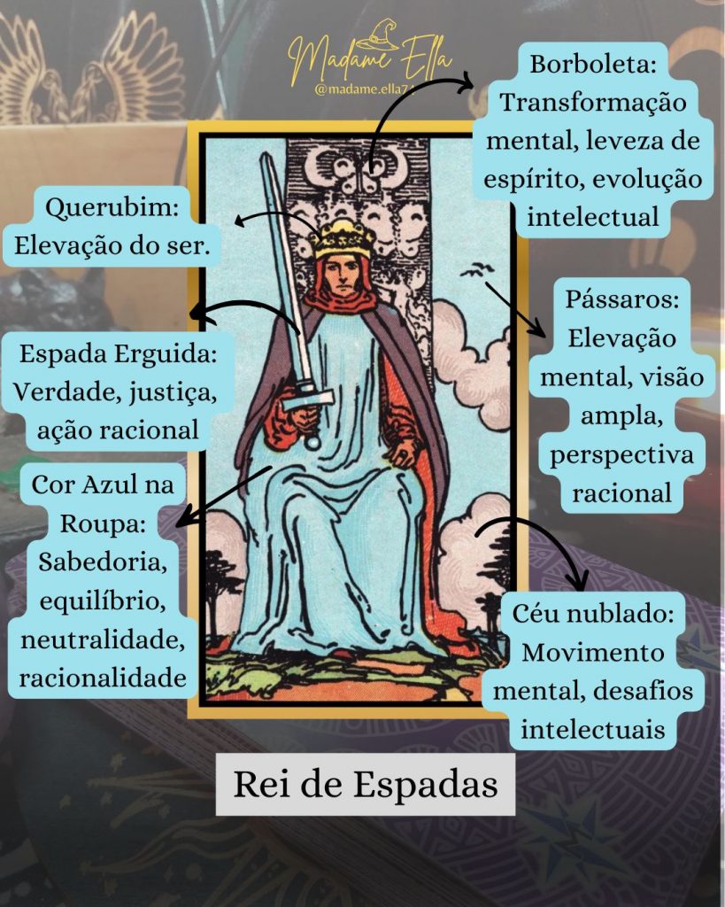 Regido pelo elemento Ar, o Rei de Espadas é a personificação da inteligência, da estratégia e da capacidade de tomar decisões com clareza. É direto, racional, dono de mil ideias, e sabe comandar com autoridade.