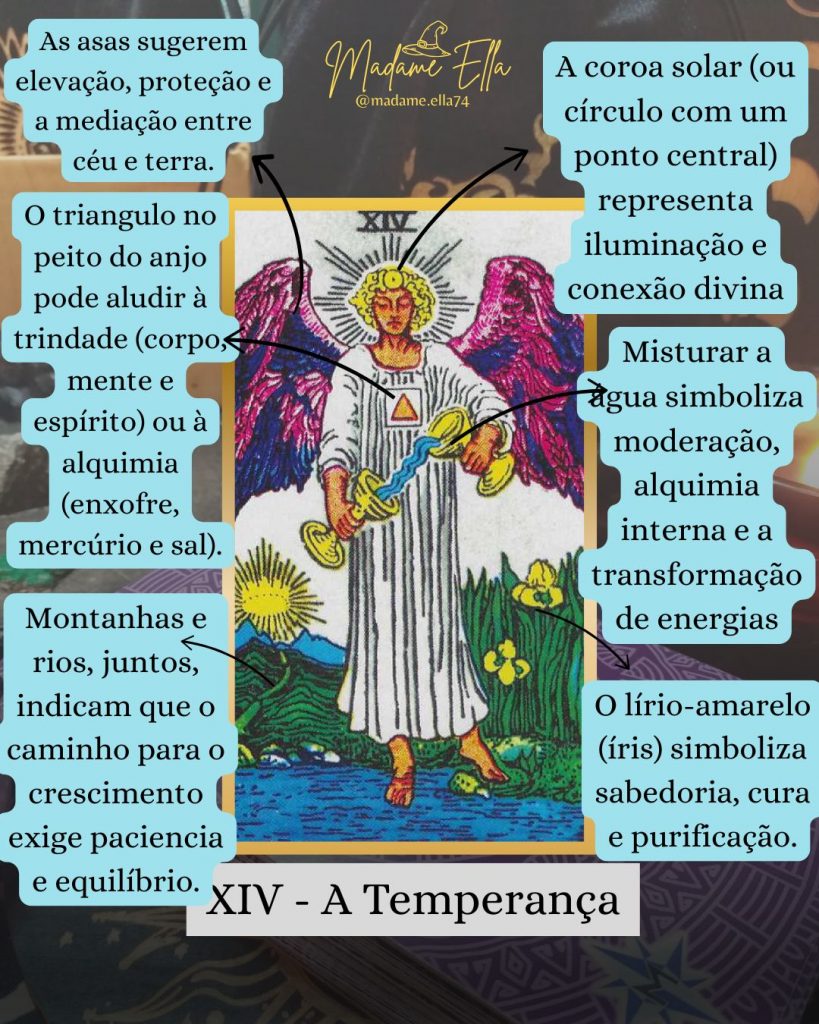 A Temperança é o Arcano Maior XIV e representa equilíbrio, moderação e integração harmoniosa.