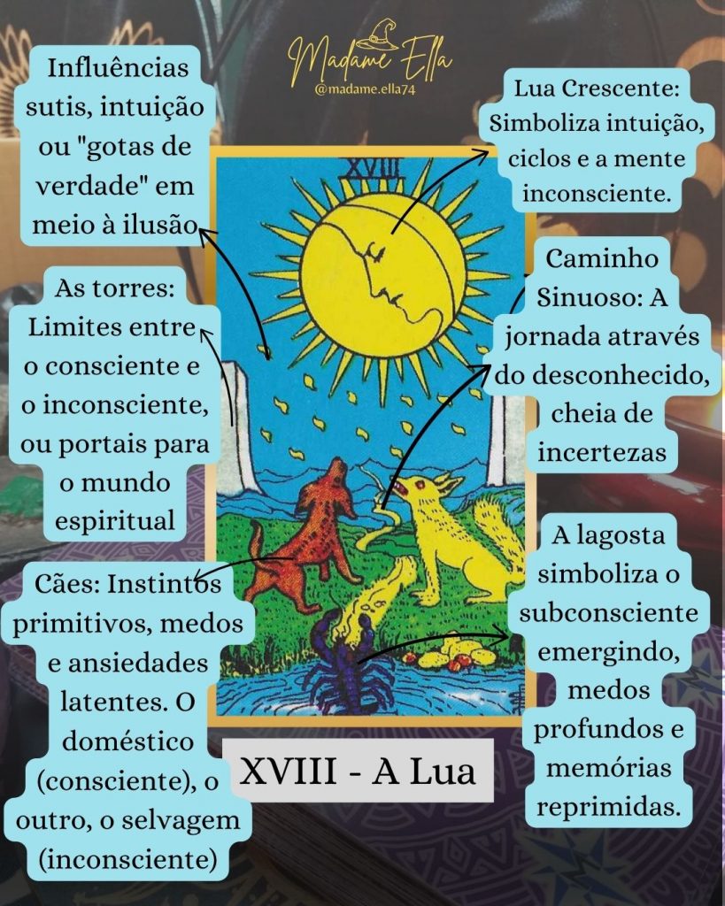 A Lua é o Arcano Maior XVIII e representa o inconsciente, a intuição e as ilusões.