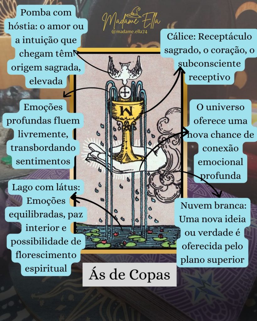 O Ás de Copas é a carta do nascimento emocional. Representa o momento em que o coração se abre para o amor, a intuição, a compaixão e a espiritualidade. É o fluxo emocional puro — como a primeira lágrima sincera, o primeiro suspiro apaixonado ou o sentimento de conexão com algo maior.