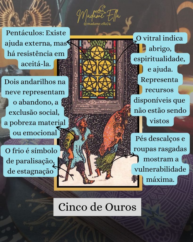 O Cinco de Ouros é a carta da escassez, da perda e da exclusão. Ela nos confronta com momentos em que algo falta — seja dinheiro, segurança, saúde, apoio emocional ou fé. Mas sob sua frieza, esconde-se uma verdade silenciosa: nem toda pobreza é eterna, e nem toda dor é solidão.