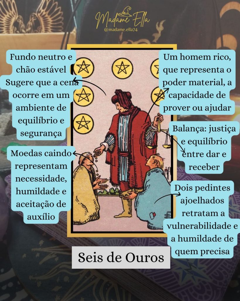 O Seis de Ouros é a carta do equilíbrio entre generosidade e necessidade, entre ter e oferecer, entre receber e agradecer. Após os desafios de escassez do Cinco de Ouros, este arcano marca um momento de reequilíbrio material e moral, onde o fluxo da vida volta a circular. Representa a abundância partilhada, mas também o poder que existe em quem dá — e a humildade de quem recebe.