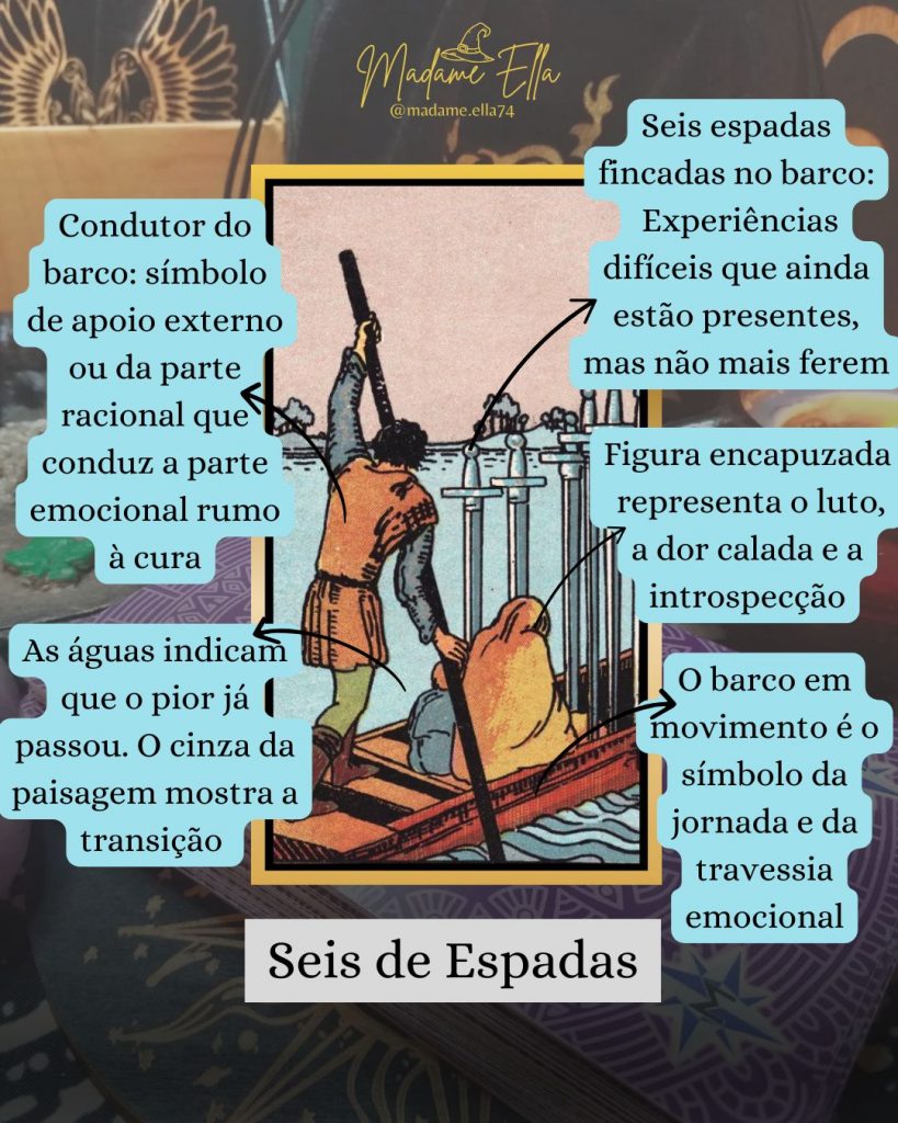No Tarô de Rider-Waite, vemos um pequeno barco deslizando sobre águas calmas. Nele, uma figura conduz a embarcação enquanto duas outras permanecem sentadas: uma delas envolta em um manto, em silêncio. As seis espadas fincadas na proa do barco não perfuram o casco, mas seguem firmes — são as experiências difíceis que nos acompanham, agora integradas e transportadas com consciência.