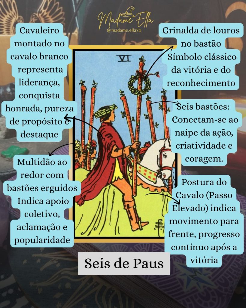 O Seis de Paus surge como um clarim que anuncia conquistas visíveis, reconhecimento público e avanço merecido. Ele representa a glória que chega após a batalha, o momento em que se colhem os louros do esforço, da coragem e da persistência. É uma carta de autoestima restaurada, de valorização e liderança.
